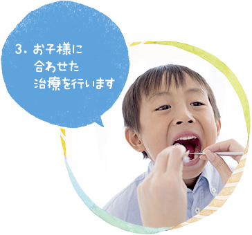 無理に治療することはせず、まずは大きくお口を開けてもらう練習からスタートし、お子様のペースに合わせて治療を進めていきます。