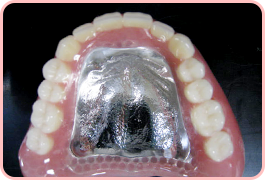 歯の代わりをする人工歯と、歯ぐきを補うピンク色の床を粘膜の吸着力で維持させます。